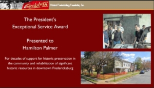 Recognizes individuals for long, faithful, and dedicated service to HFFI and the cause of preservation in the Fredericksburg area.