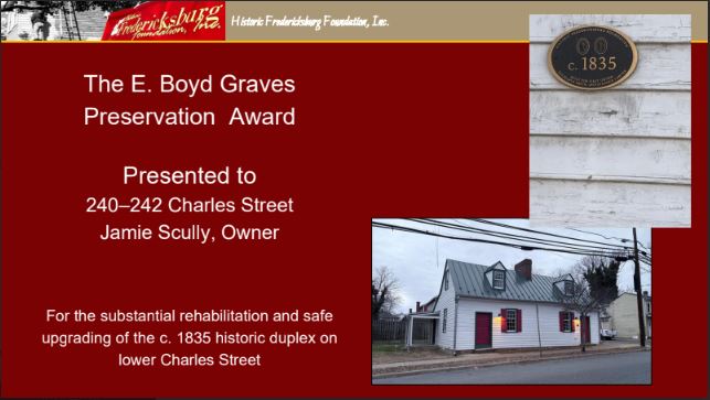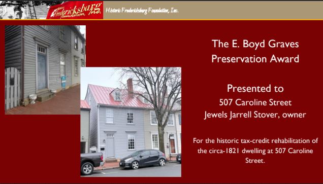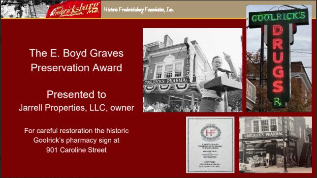 Originally known as the Preservation Achievement Award, the name was changed in 1988 to honor the late E. Boyd Graves; a founding member of HFFI, for his many years of service to local preservation and the instrumental role he played in the protection, restoration, and adaptive reuse of some of Fredericksburg’s most recognizable historic landmarks, including, most notably, the Silversmith House (813 Sophia Street) in 1962.