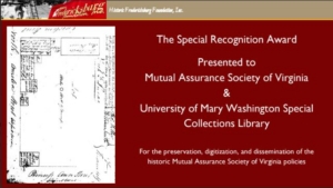 For a person, business, or organization that has gone above and beyond in Fredericksburg Area preservation and education, framed certificate.